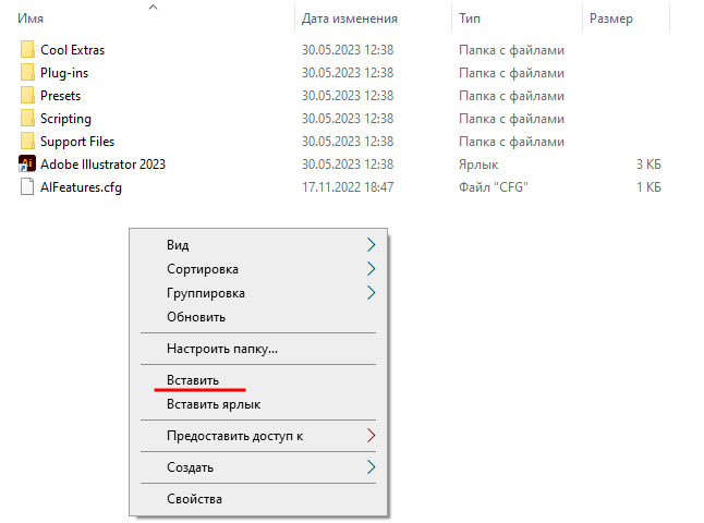 - Перейти в папку Adobe Illustrator, обычно распологается по пути C:\Program Files\Adobe\Adobe Illustrator 2023, нажать правой кнопкой по пустому пространству и выбрать Вставить