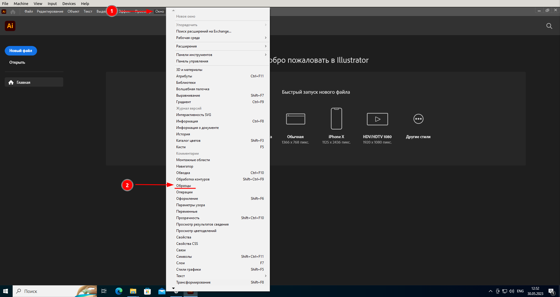- Открыть Adobe Illustrator, нажать вкладку Окно сверху, в выпадающем меню нажать по Образцы