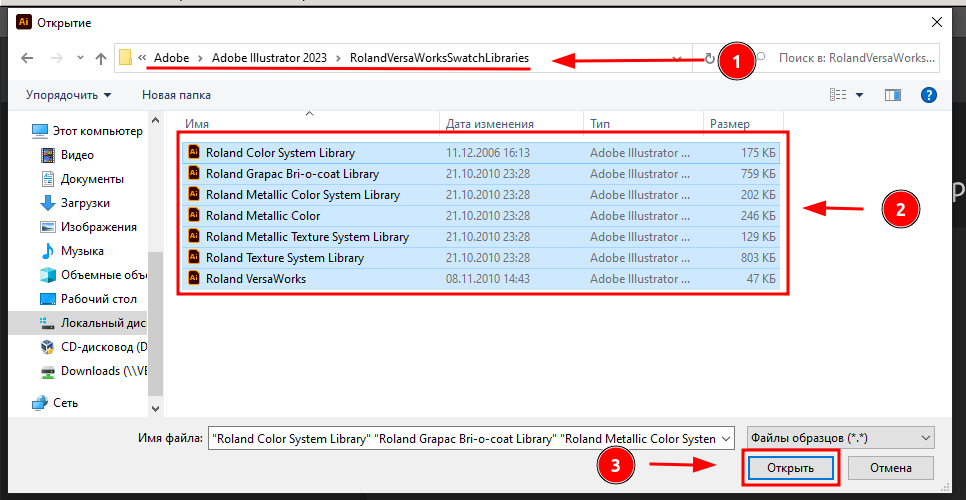 - В открывшемся окне перейти в папку Adobe Illustrator, куда скопировали папку с образцами, обычно распологается по пути C:\Program Files\Adobe\Adobe Illustrator 2023, открыть папку с образцами, выделить всё и нажать кнопку Открыть