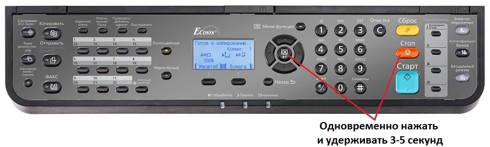 То нужно одновременно удерживать круглую кнопку ОК и красную кнопку Стоп примерно 3-5 секунд
