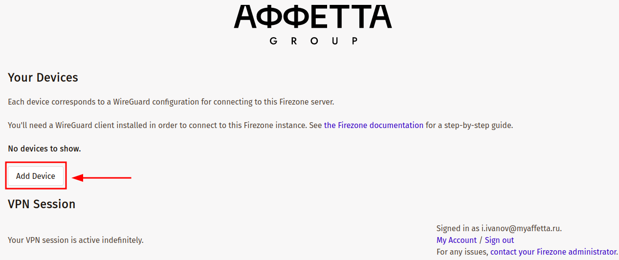 2.2 Нажать по кнопке Add Device!!!ВАЖНО!!! Для каждого устройства должен быть создан свой профиль, использование одного и того же профиля на нескольких устройствах одновременно приведет к непредвиденным проблемам с VPN.