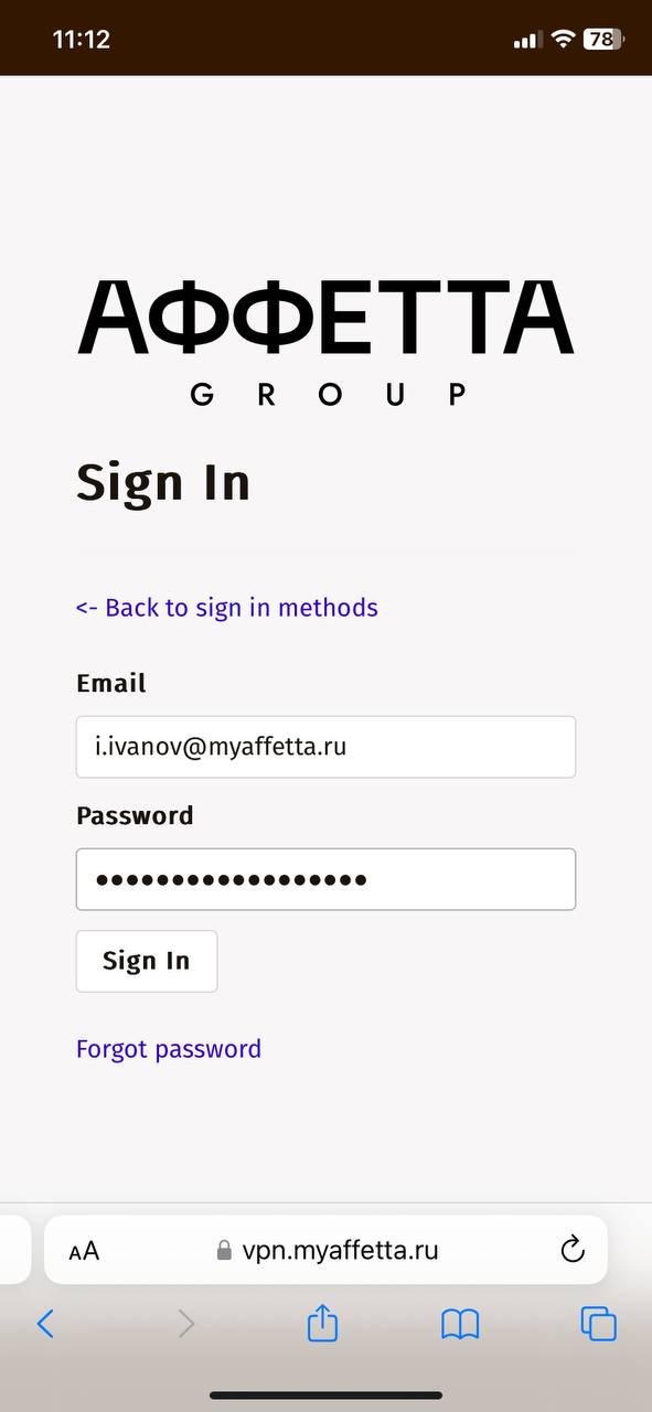 4.1 Перейти по адресу https://vpn.myaffetta.ru и ввести свои учетные данные
