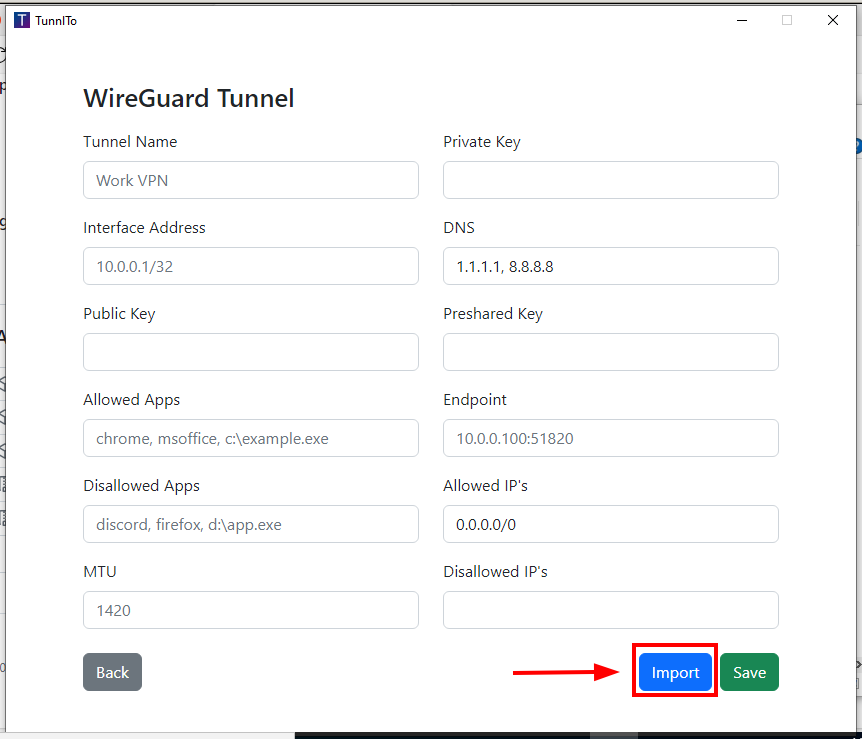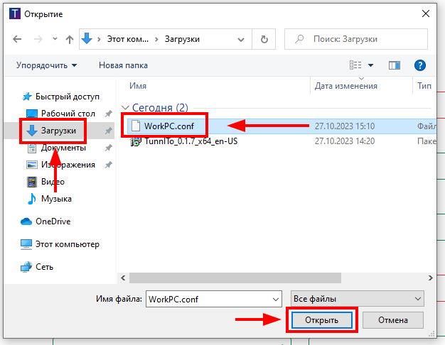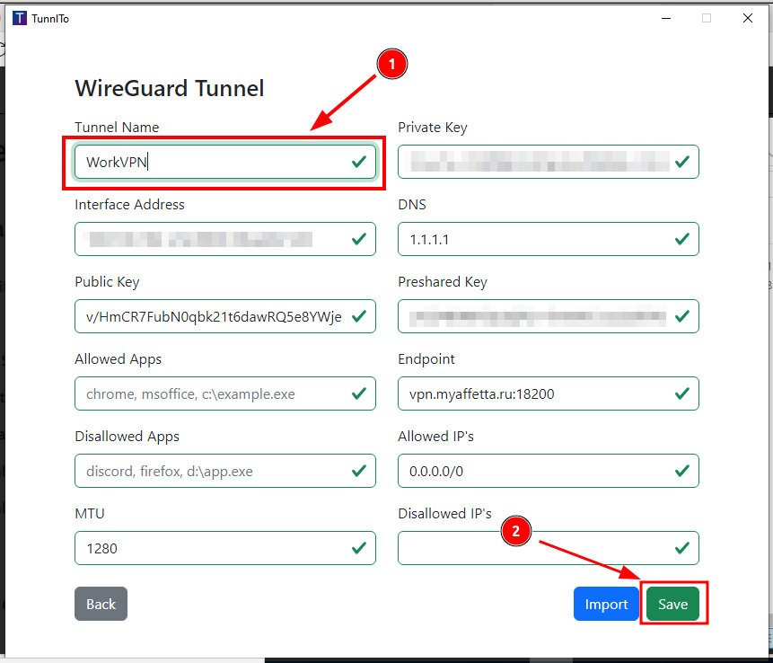 3.1 Открыть приложение Wireguard и нажать кнопку Импорт туннелей из файла